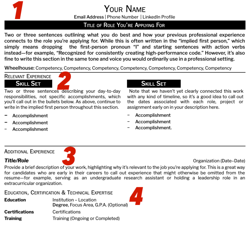 Structurally, these resumes consist of three parts, enumerated in the following image. You should also download our reverse-chronological resume template if you're looking for more detailed, hands-on guidance.